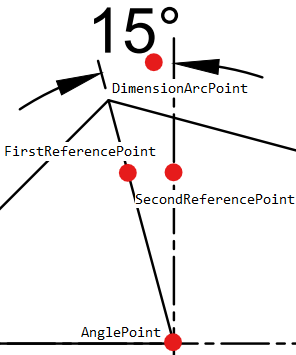 AnglePoint specifies the tip of the measured angle. FirstReferencePoint and SecondReferencePoint lie on the extension lines. DimensionArcPoint lies on the dimension line.