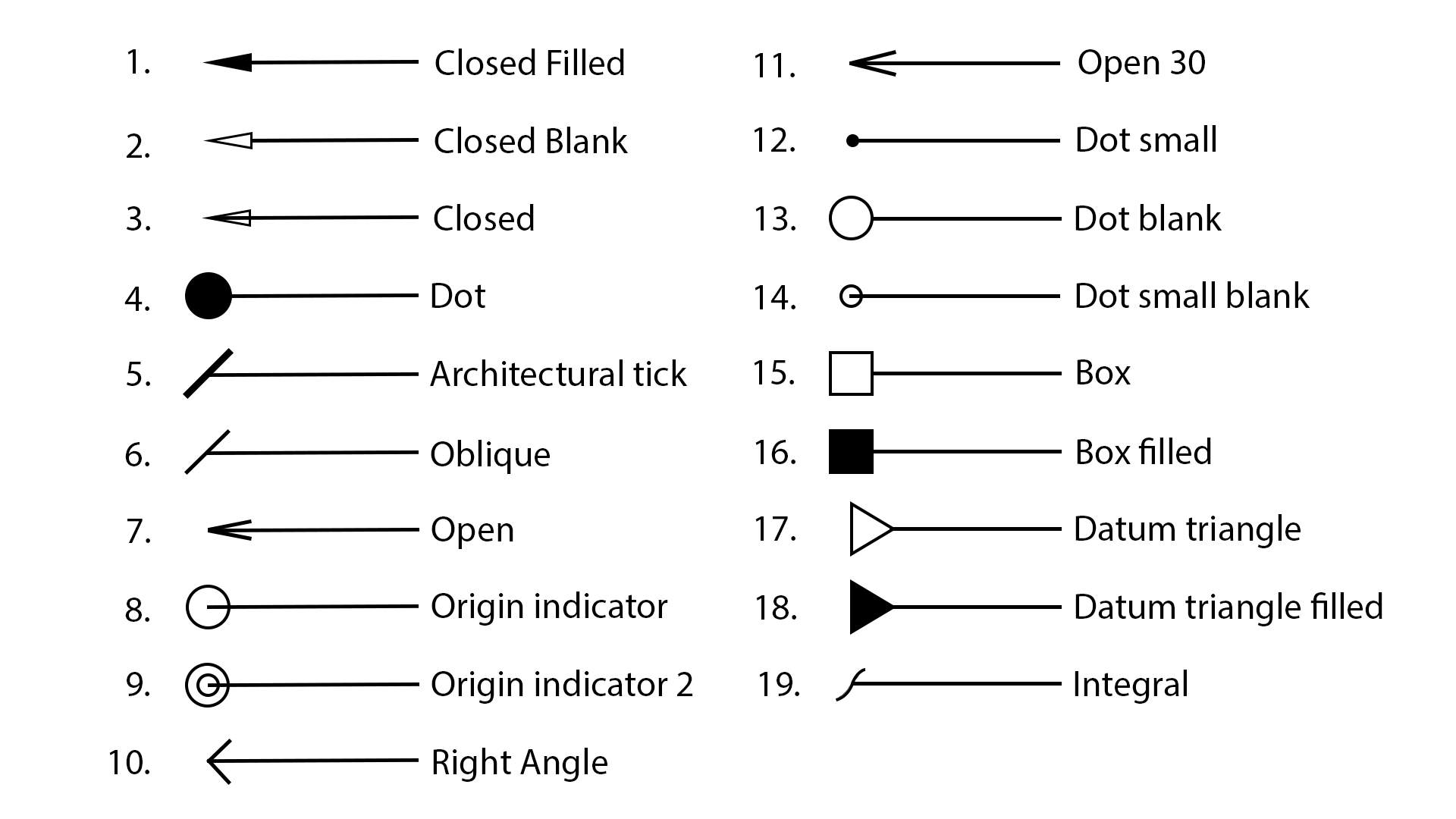 | enum | ArrowType { Undefined = 0 , ClosedFilled = 1 , ClosedBlank = 2 , Closed = 3 , Dot = 4 , ArchitecturalTick = 5 , Oblique = 6 , Open = 7 , OriginIndicator = 8 , OriginIndicator2 = 9 , RightAngle = 10 , Open30 = 11 , DotSmall = 12 , DotBlank = 13 , DotSmallBlank = 14 , Box = 15 , BoxFilled = 16 , DatumTriangle = 17 , DatumTriangleFilled = 18 , Integral = 19 } |