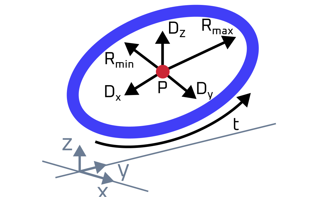An ellipse is a periodic curve parametrized as follows: \(\mathbf{C}(t) = \mathbf{P} + R_{major}\cos(t)\mathbf{X} + R_{minor}\sin(t)\mathbf{Y}\), where
