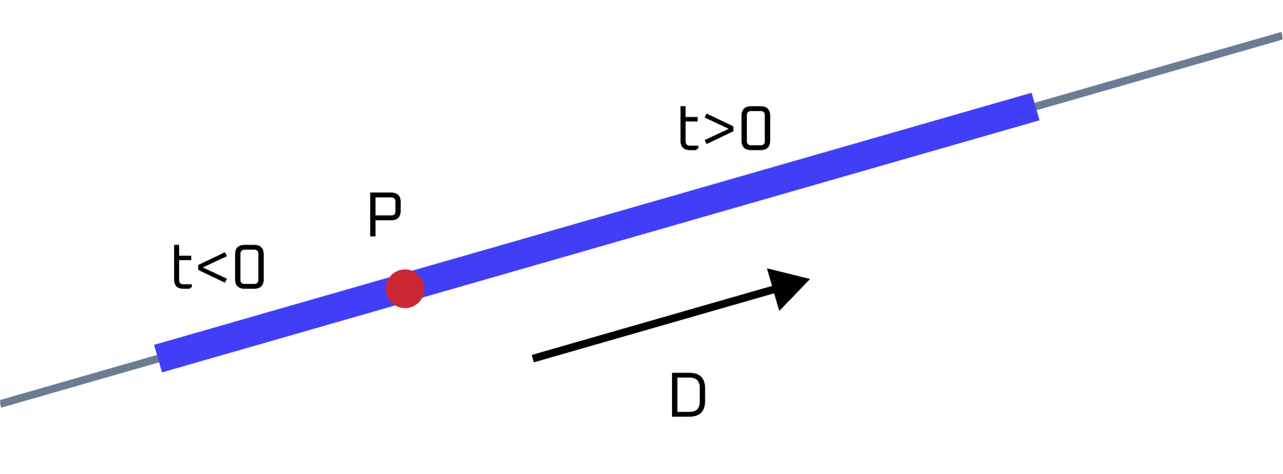 A line is parametrized as follows: \(\mathbf{C}(t) = \mathbf{P} + t\mathbf{D}\), where