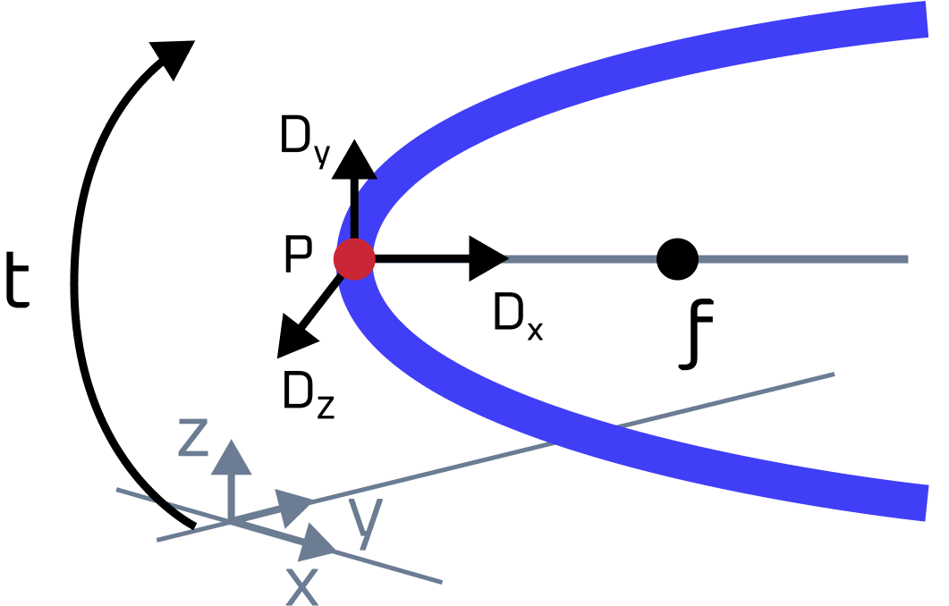 A parabola is defined by axis placement and focal. The following image depicts a parabola example: