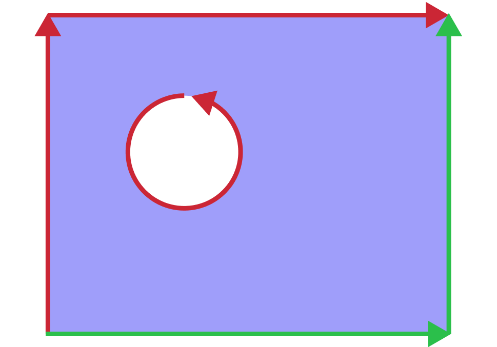 The following image depicts an example of face with two wires and p-curves in parametric space of the face surface. P-curves of edges with forward orientation are displayed in green, p-curves of edges with reversed orientation are displayed in red: