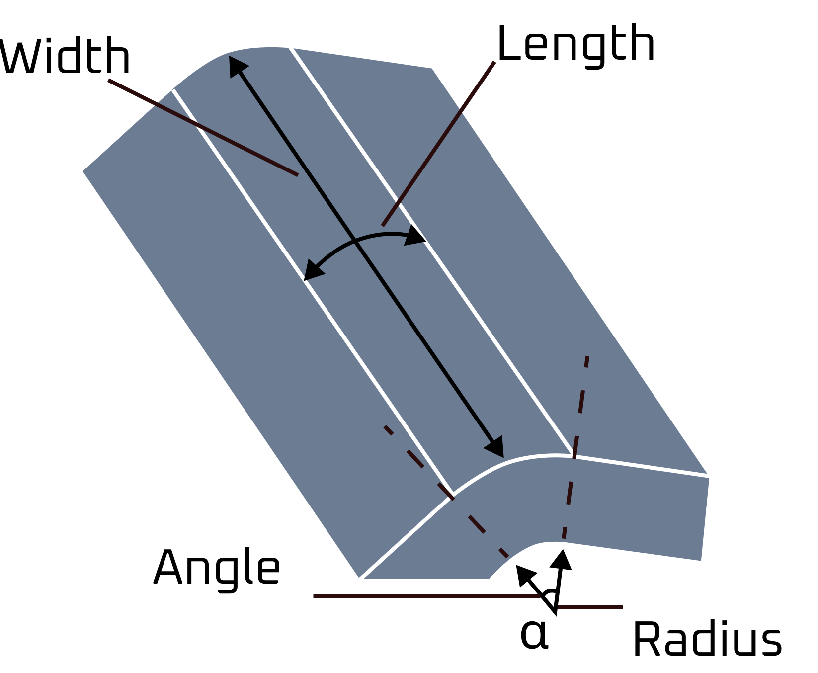Bends have the following basic parameters: radius in mm, angle in radians, width in mm and length in mm.