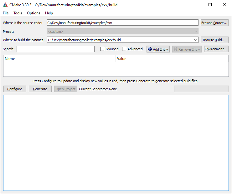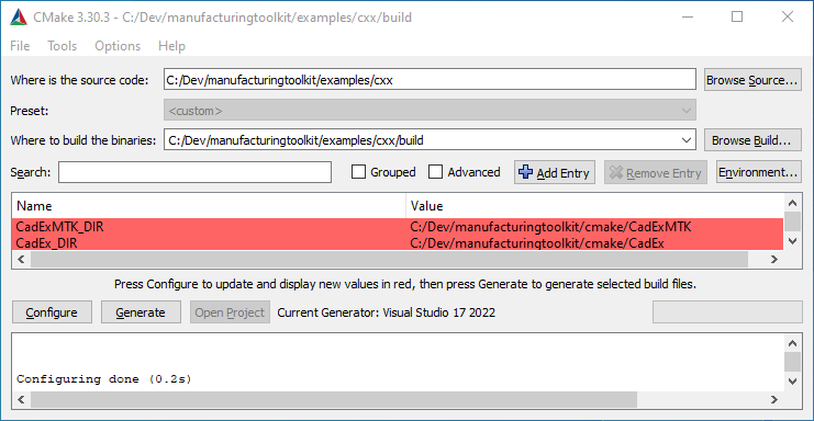 cmake --help. -DCMAKE_BUILD_TYPE=Debug.To run built examples, you should add the path to Manufacturing Toolkit dynamic libraries directory to the environment variable LD_LIBRARY_PATH on Linux and DYLD_LIBRARY_PATH on MacOS.