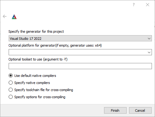 Next specify required Visual Studio version (e.g. Visual Studio 17 2019 Win64).