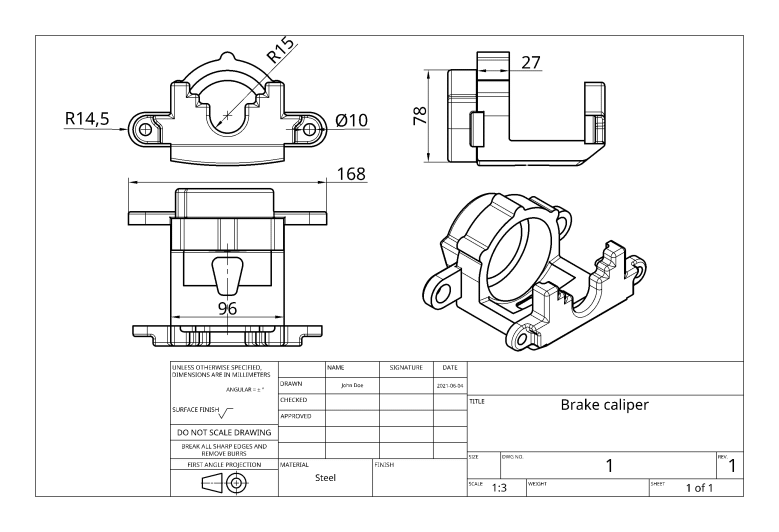 The example drawing at the top of the page is composed of a single sheet with 4 views (3 side views and 1 isometric view).