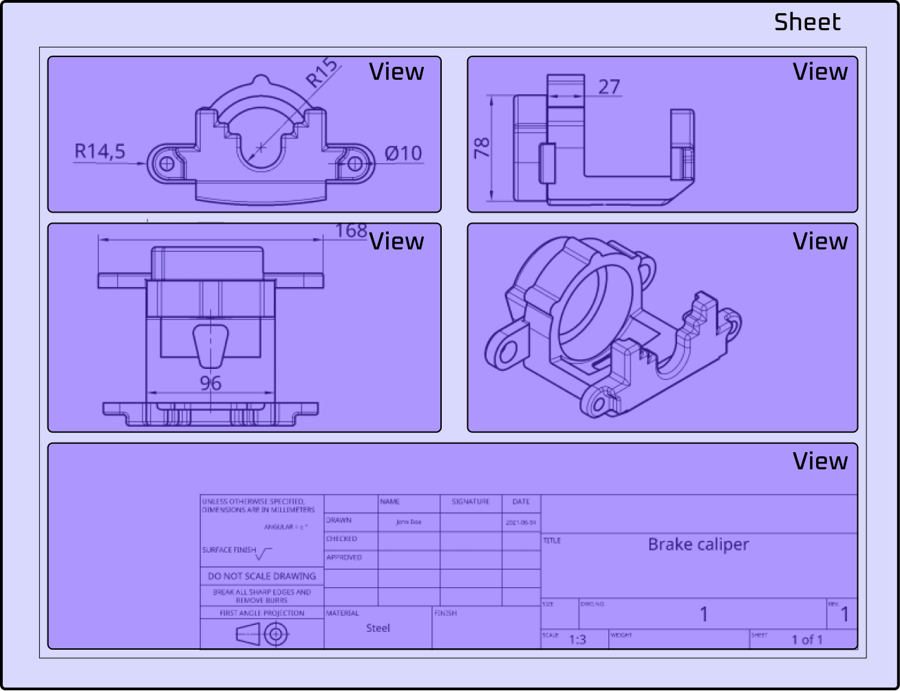 Sheets represent the physical sheets of paper used in real-world drawings. Each sheet has a defined size and orientation. Since one sheet may not be sufficient to capture all the details of a 3D model, a drawing often includes multiple sheets, each containing several model views. In the Manufacturing Toolkit, this concept is represented by the Drawing.Sheet class.