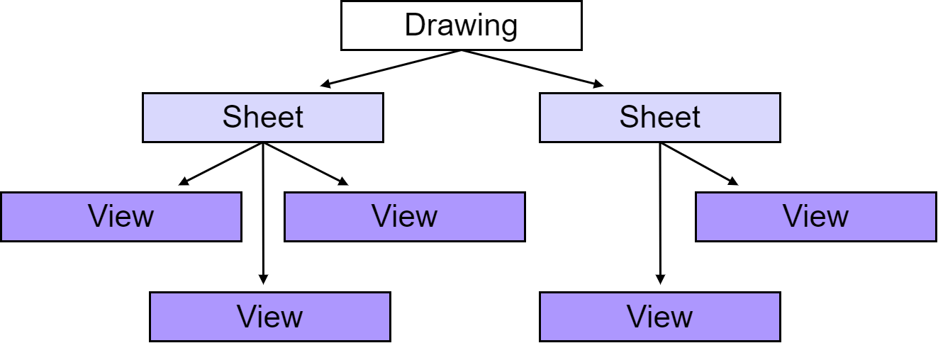 Drawing.Drawing is the primary class responsible for encapsulating all information related to a model drawing. If the imported model includes drawing data, this will be stored as Drawing.Drawing in the ModelData.Model class. The drawing structure is composed of two main elements: sheets and views. The diagram below shows a possible drawing structure: