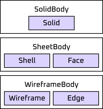Manufacturing Toolkit supports the next types of bodies: ModelData.SolidBody , ModelData.SheetBody and ModelData.WireframeBody . These bodies form the B-Rep representation of a part.
