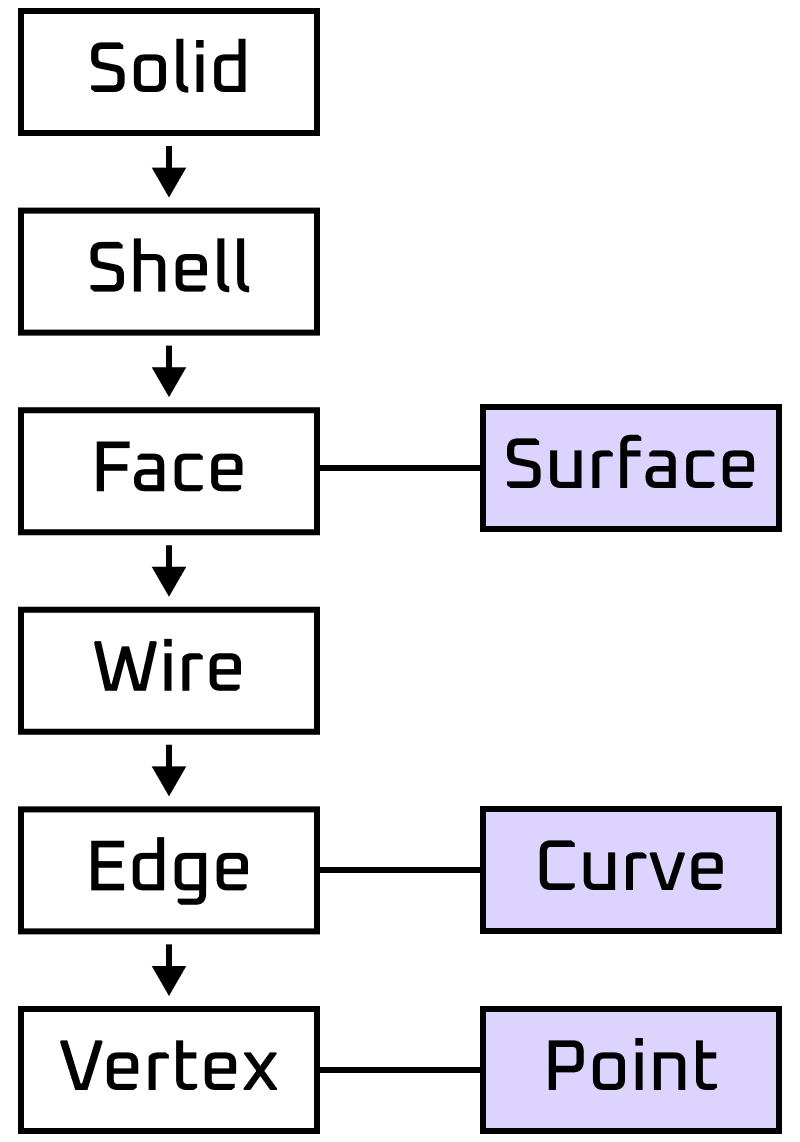 B-Rep includes a topological model that describes hierarchy and connectivity information between elements in a 3D model (from vertices to a solid), as well as the underlying geometry entities (points, curves and surfaces):
