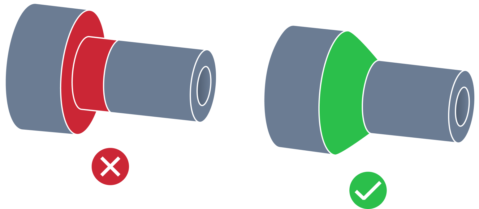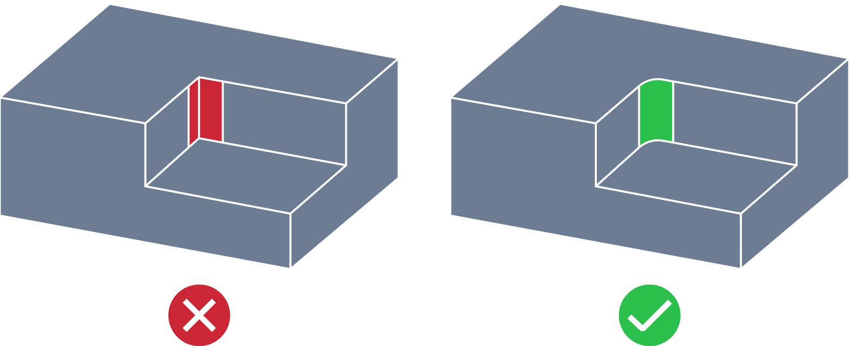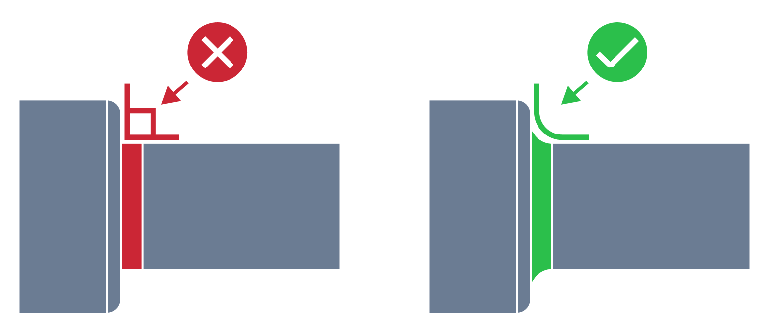 | External Edge Fillet | When designing external edges in CNC machining milling, filleting can pose some issues that need to be considered. Filleting the external edge can potentially lead to stress concentration points due to the bend of the fillet, leading to weak and broken corners. The production of fillets on the external edge also requires special tooling and milling techniques that are expensive compared to other machining methods, e.g. chamfering. Chamfers are preferable compared to fillets on the external edge in CNC machining milling design due to their ability to reduce stress concentrations, provide better clearance, reduce manufacturing costs, and improve overall appearance. |