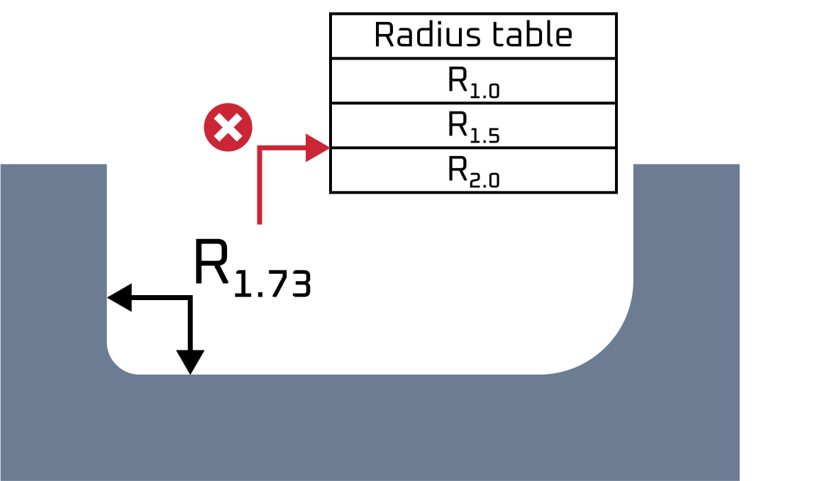 | Non Standard Radius Floor Fillet | A non standard milled part floor radius can be problematic in CNC machining milling design due to the need for special tooling and custom grinding, which can be more expensive and limit the availability of suitable tools. Adjusting cutting parameters can also impact machining time and tool life. Workpiece stability may be compromised due to the added complexity, which can affect surface finish if chatter or vibration occurs. |