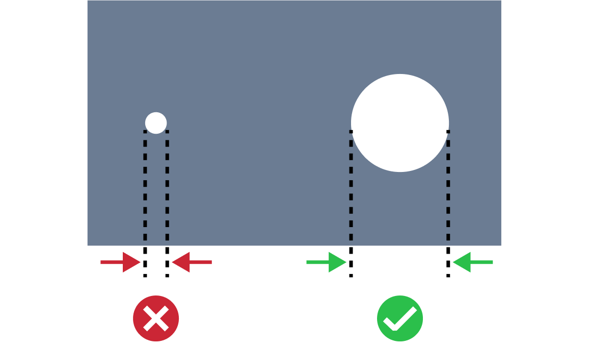 | Small Hole Diameter | Small hole diameter issue refers to the problem where holes with a diameter of less than required may cause deformation or cracking of the metal. This happens because the force required to create the hole exceeds the yield strength of the material, causing it to buckle or distort. |