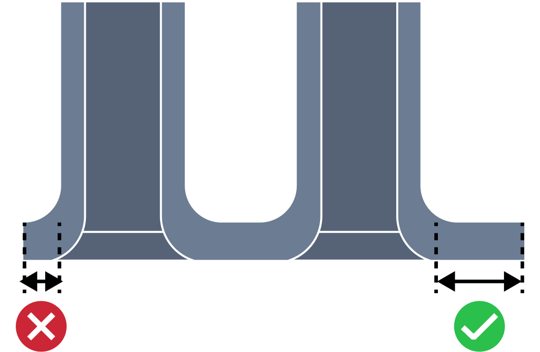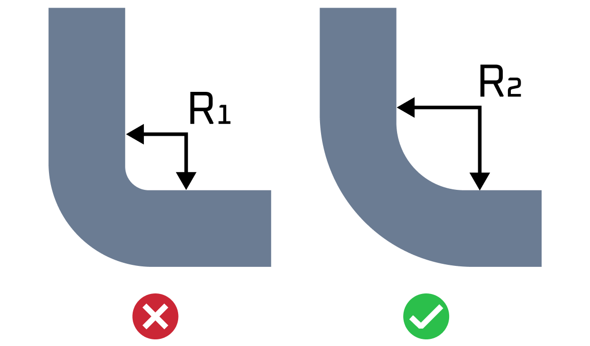 | Inconsistent Bend Radii | This issue occurs when the radius of a bend varies from one section to another, resulting in uneven distribution of stress and strain in the part. Avoiding variety in bend radii help to minimize setup changes during the manufacturing process. When the bend radius is consistent, the machine settings can be standardized, which means that less time will be spent making adjustments between parts. |