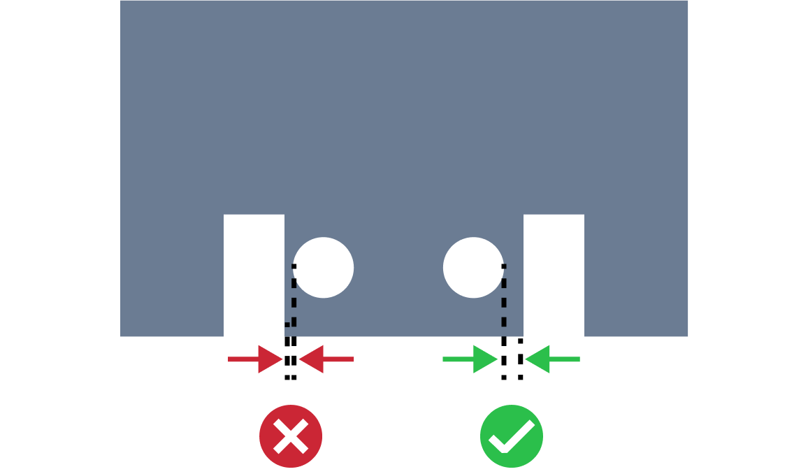 | Small Distance Between Hole And Notch | When a hole and notch are placed too close together, it can cause the surrounding metal to weaken and potentially crack, leading to structural issues or failure. This is particularly important in applications where the sheet metal will be subjected to high levels of stress or strain, such as in load-bearing structures or in parts that will be exposed to vibration or other types of mechanical stress. |