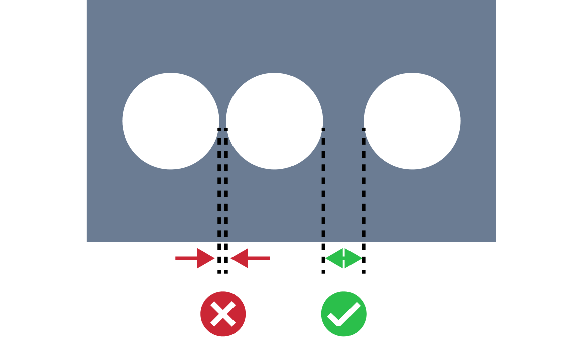 | Small Distance Between Holes | When designing sheet metal parts with multiple holes, it is important to consider the spacing between those holes. If the distance between the holes is small, the material between them will become thinner, which can cause the sheet metal part to become weaker and potentially break under stress. This is because the stress applied to the sheet metal part is not distributed evenly throughout the part, and the material between the holes is not strong enough to handle the load. |