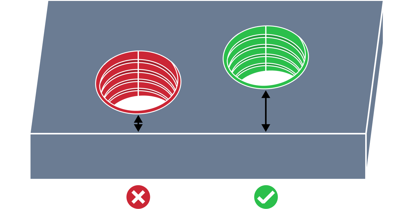 | Intersecting Cavity Hole | In CNC machining, the issue of holes intersecting cavities can arise when designing a part that requires both through-holes and closed cavities. If the cavity intersects with the hole, it can create a number of issues during the drilling process. The drill bit may become trapped in the cavity, or the drill may produce an irregularly-shaped hole that does not pass cleanly through the part. In extreme cases, the drill bit may even break off inside the part, causing damage and requiring costly repairs. It's better to avoid drilling a hole through the cavity or at least maximize the drilled material percent, so that the center line of a hole will be outside the cavity. |