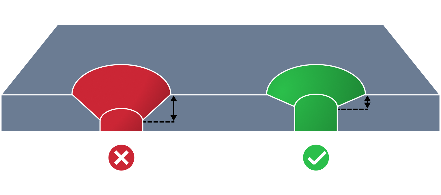 | Large Depth Countersink | Large depth countersink issue occurs when the countersink is too deep for the sheet thickness, causing material displacement and a bulge on the opposite face. This deformation can lead to poor surface quality, misalignment during assembly, and potential weakening of the sheet around the hole. |